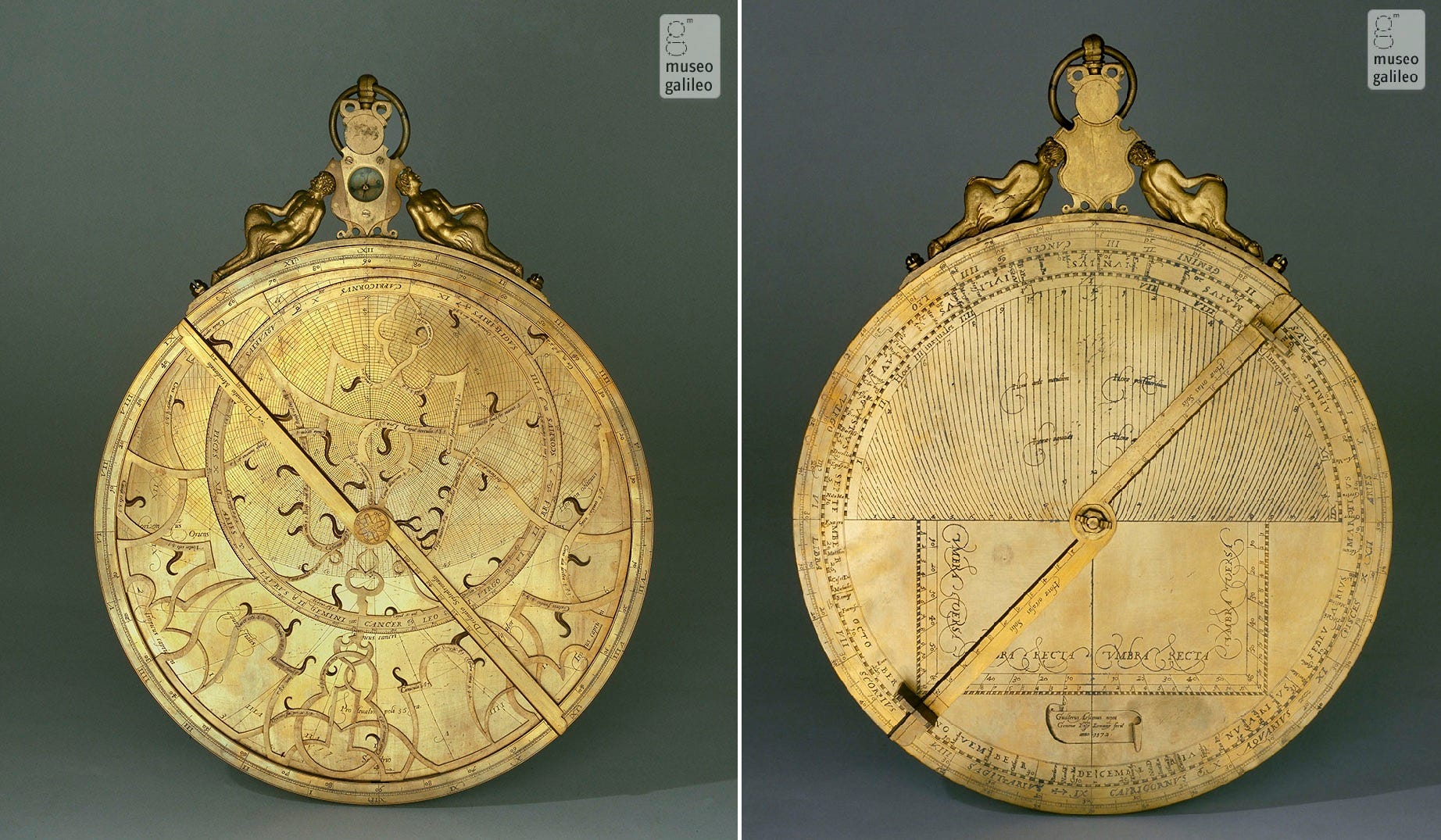 На выцветшем синем бархате лежит сложный латунный инструмент, густо покрытый шкалами, окружностями и ажурной вязью. Это астролябия фламандского мастера Гуалтеруса Арсениуса — по сути навигатор, часы и калькулятор звездного неба в одном корпусе. Но больше всего поражают крошечные скульптуры, поддерживающие подвес с компасом. И тут возникает почти неизбежный вопрос: зачем этому строгому математическому прибору нужна скульптура?