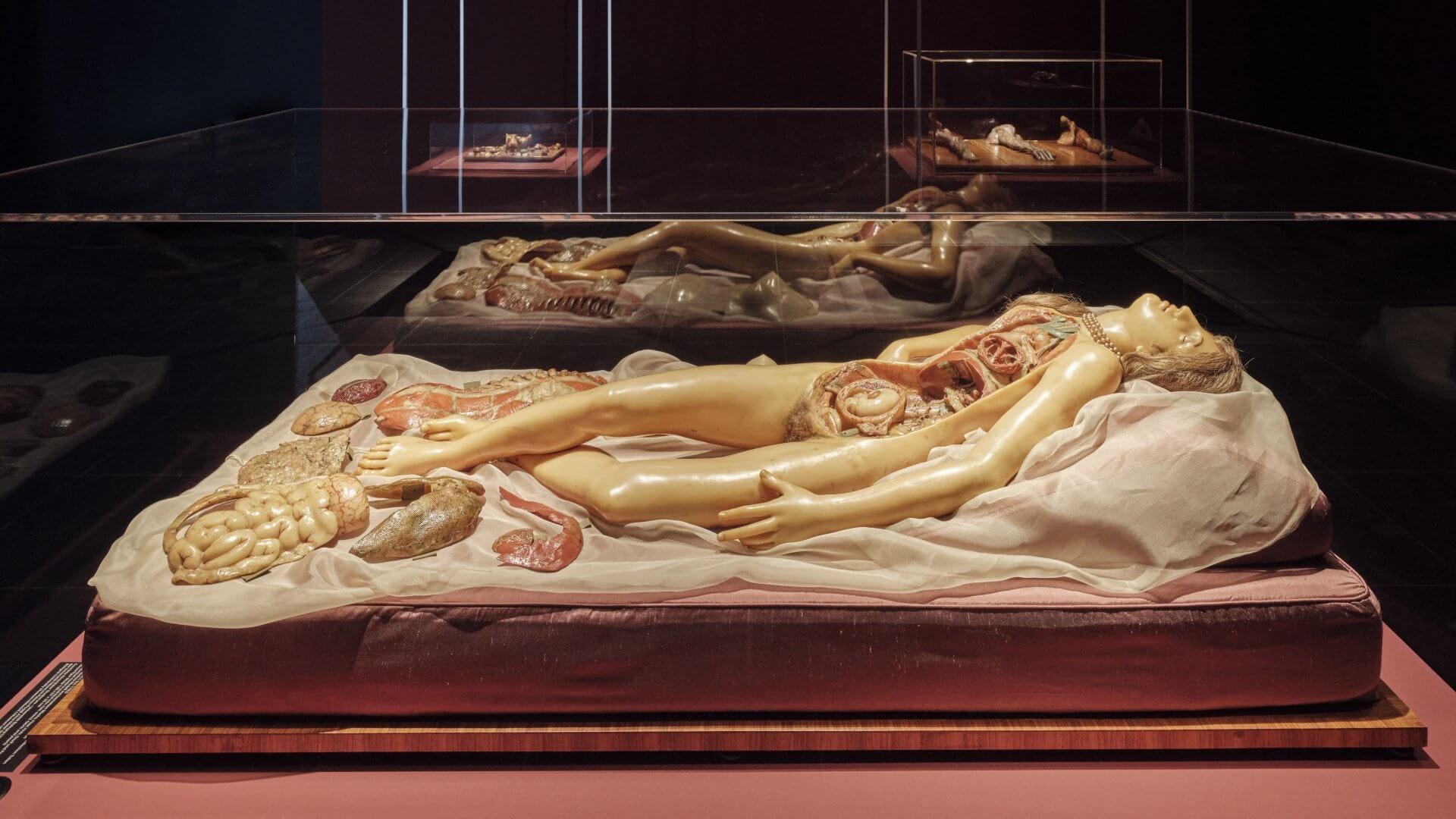 Это женская фигура в натуральную величину. Жемчужное ожерелье, настоящие человеческие волосы. Поза — расслабленная нега, заимствованная с полотен Тициана и Джорджоне, но при всей чувственной красоте ее грудная клетка вскрыта. Студент-медик мог шаг за шагом снимать восковые слои: извлечь легкие, сердце, желудок, вплоть до крошечного свернувшегося плода в матке. Если убрать томную позу, жемчуг и идеализированные черты, останется расчлененное тело, от которого хочется отвернуться.