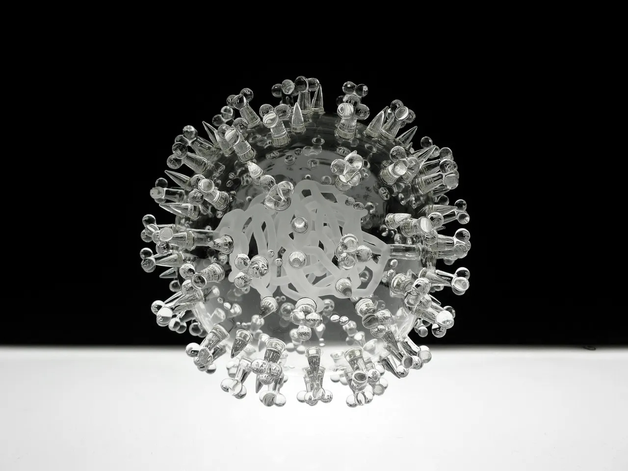 Другой путь — работа с тем, что не имеет привычного визуального облика. Британец Люк Джерам создает стеклянные скульптуры вирусов: ВИЧ, Эбола, бактериофаг T4, ковид. Пугающе красивые, и при этом абсолютно прозрачные и бесцветные. И вот тут начинается самое интересное.