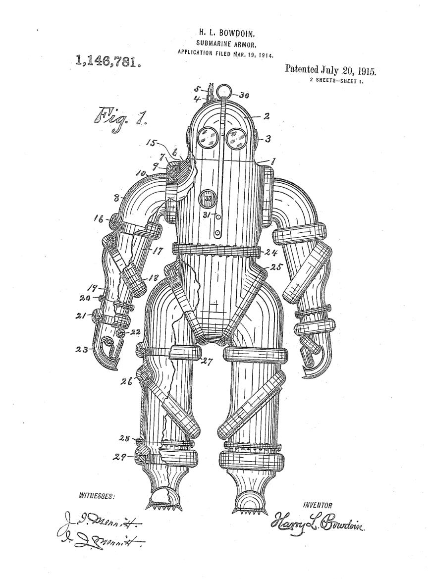 Патентное ведомство, впрочем, это не смутило, и изобретатель получил заветное свидетельство. Думаю, Боудойн был даже не первым с подобной идеей, но главной проблемой таких скафандров оказалась не масса и не материалы, а подвижность.