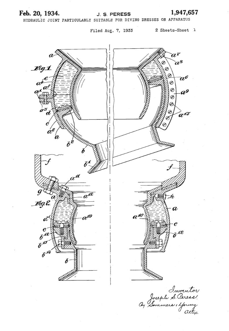 Прорыв в этой области совершил британский инженер Джозеф Салим Пересс. В 1922 году он придумал полусферические суставы из магниевого сплава с кольцевой камерой, заполненной водой или другой несжимаемой жидкостью. В 1930 году Пересс представил скафандр Tritonia на их основе.