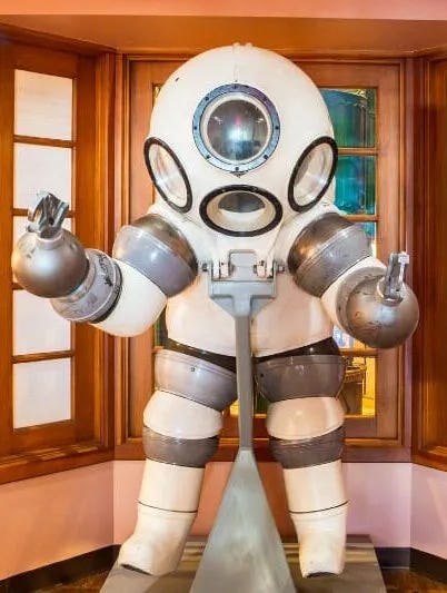Сейчас такие штуки называют Atmospheric Diving Suit, или нормобарический скафандр. А тогда у Боудойна вышла эпическая конструкция то ли силовая броня из Fallout, то ли панцеркляйн из «Операции Silent Storm».