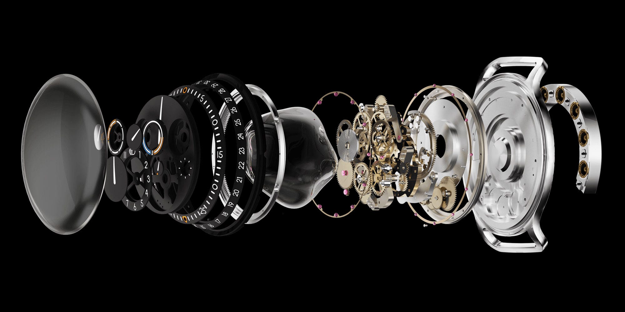 Конструкция Ressence Type 5 разделена на две камеры: нижняя, сухая, содержит модифицированный механизм ETA 2824-2, а верхняя залита 37,5 миллилитрами масла. Камеры связаны магнитной муфтой — никакого механического соединения, а семь сильфонов компенсируют расширение масла.