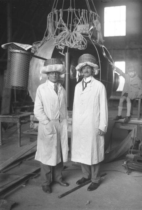 Огюст Пикар и Пауль Кипфер перед началом полета. Немецкие власти настаивали на том, чтобы они надели шлемы. Пиккар и его второй пилот их, конечно, не захватили, поэтому накинули на головы корзинки и задраили люк