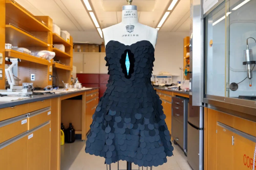 Студентка факультета моды и ученые Корнельского университета создали материал, который поглощает свет лучше любых других тканей, и пошили из него платье. Его центральная вставка отражает всего 0,13% видимого света. Для сравнения: порог для ультрачерных материалов составляет 0,5%. При этом она сохраняет насыщенный черный цвет при взгляде под углом до 60 градусов. Секрет в структуре, которую ученые скопировали у великолепной райской птицы (Ptiloris magnificus).